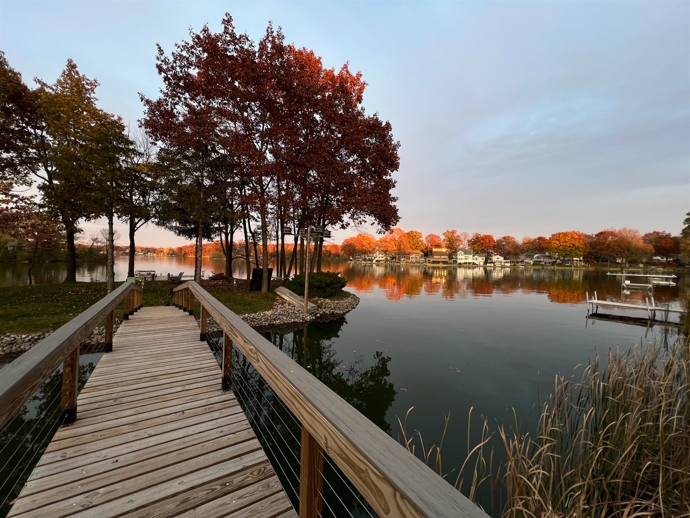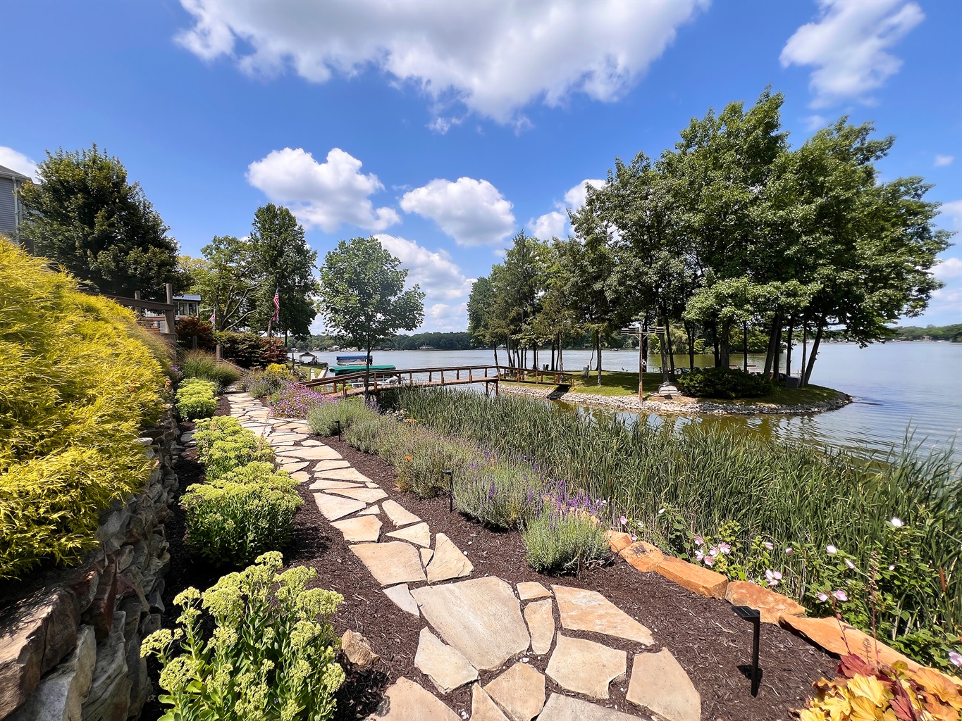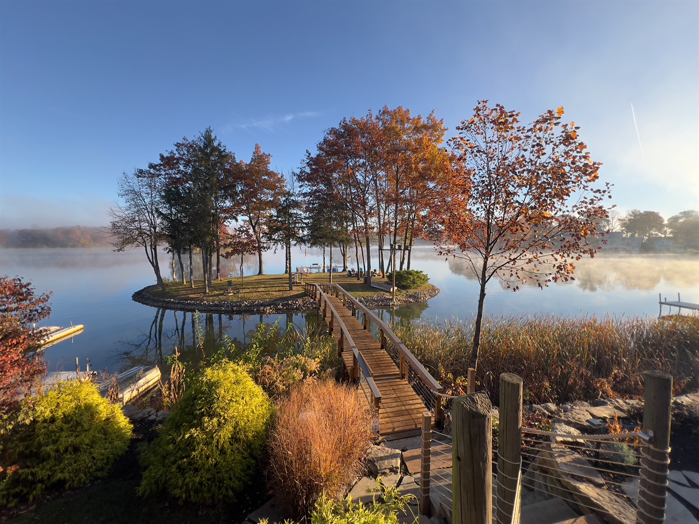 Slide open the doors to a wraparound deck with lounge seating and a Weber grill. Steps lead to 100+ feet of lake frontage and a 72-foot footbridge connecting to your private island—a shady green space for lawn games, a stone fire pit beneath mature trees, and an 84-foot pier with benches for sunrise coffee and golden-hour sunsets.