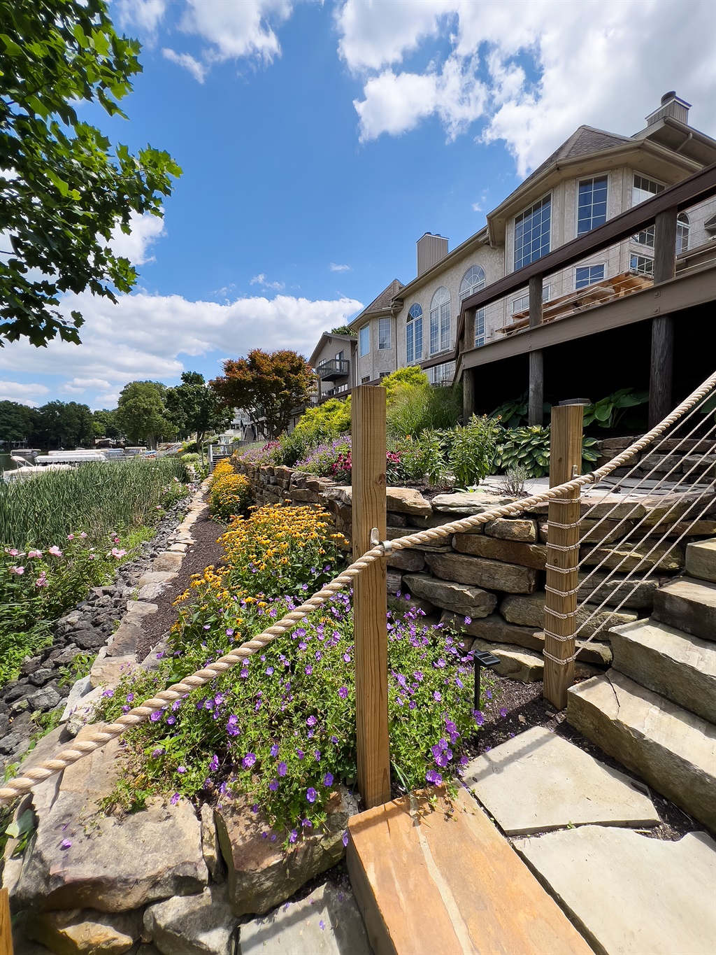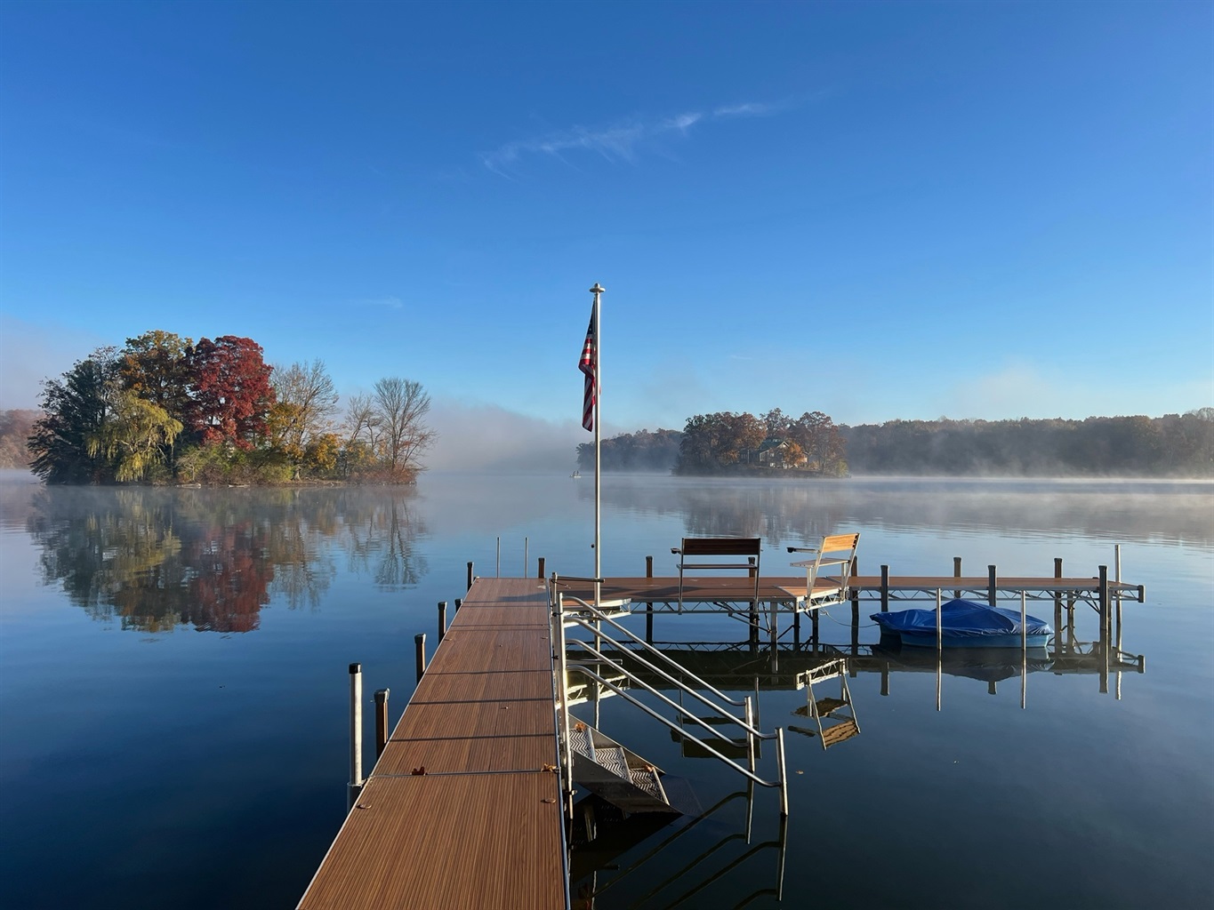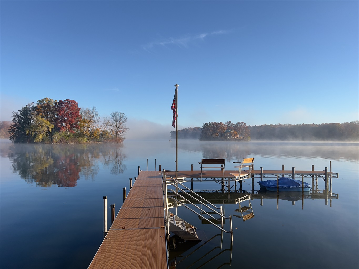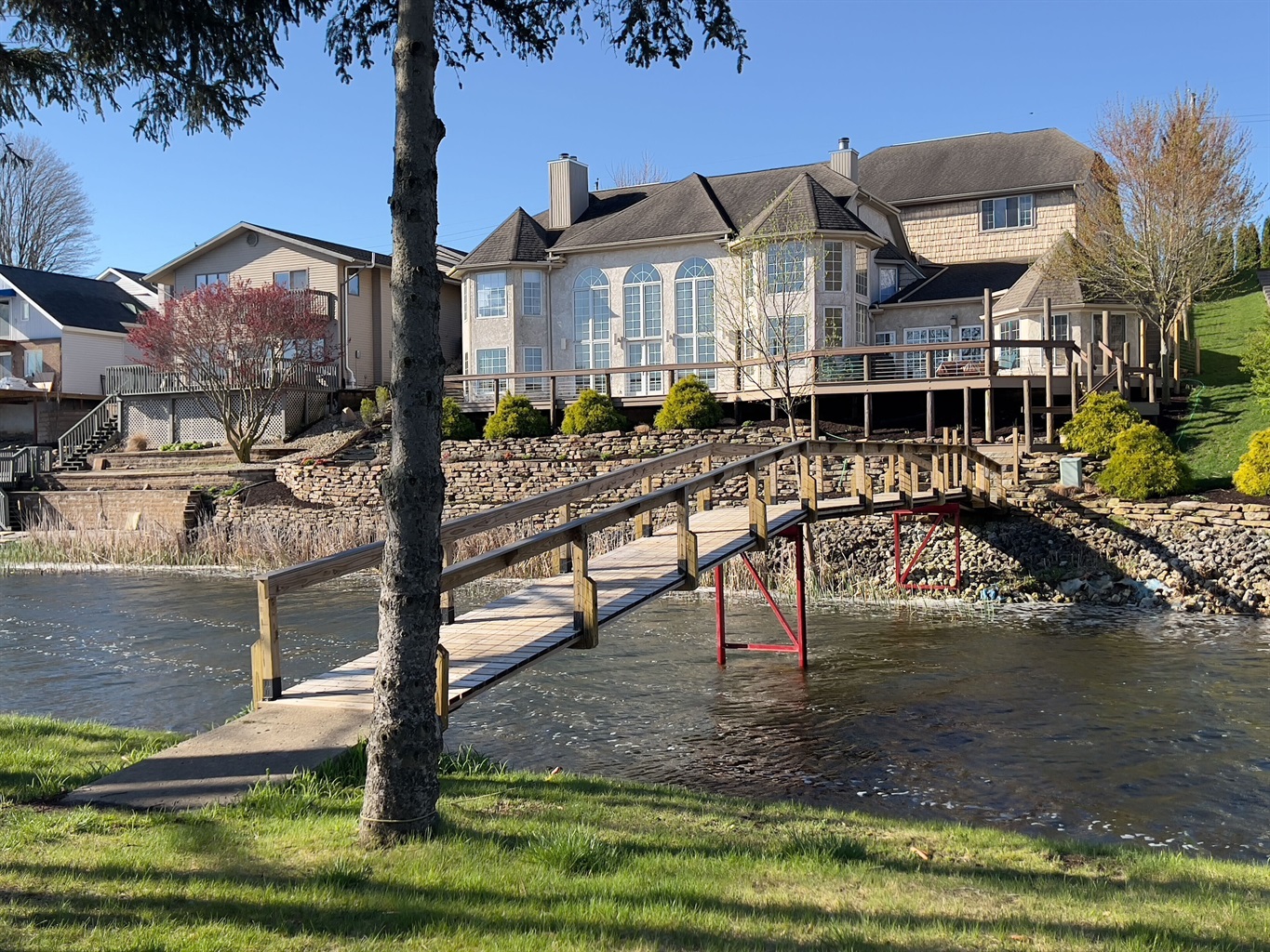 Slide open the doors to a wraparound deck with lounge seating and a Weber grill. Steps lead to 100+ feet of lake frontage and a 72-foot footbridge connecting to your private island—a shady green space for lawn games, a stone fire pit beneath mature trees, and an 84-foot pier with benches for sunrise coffee and golden-hour sunsets.