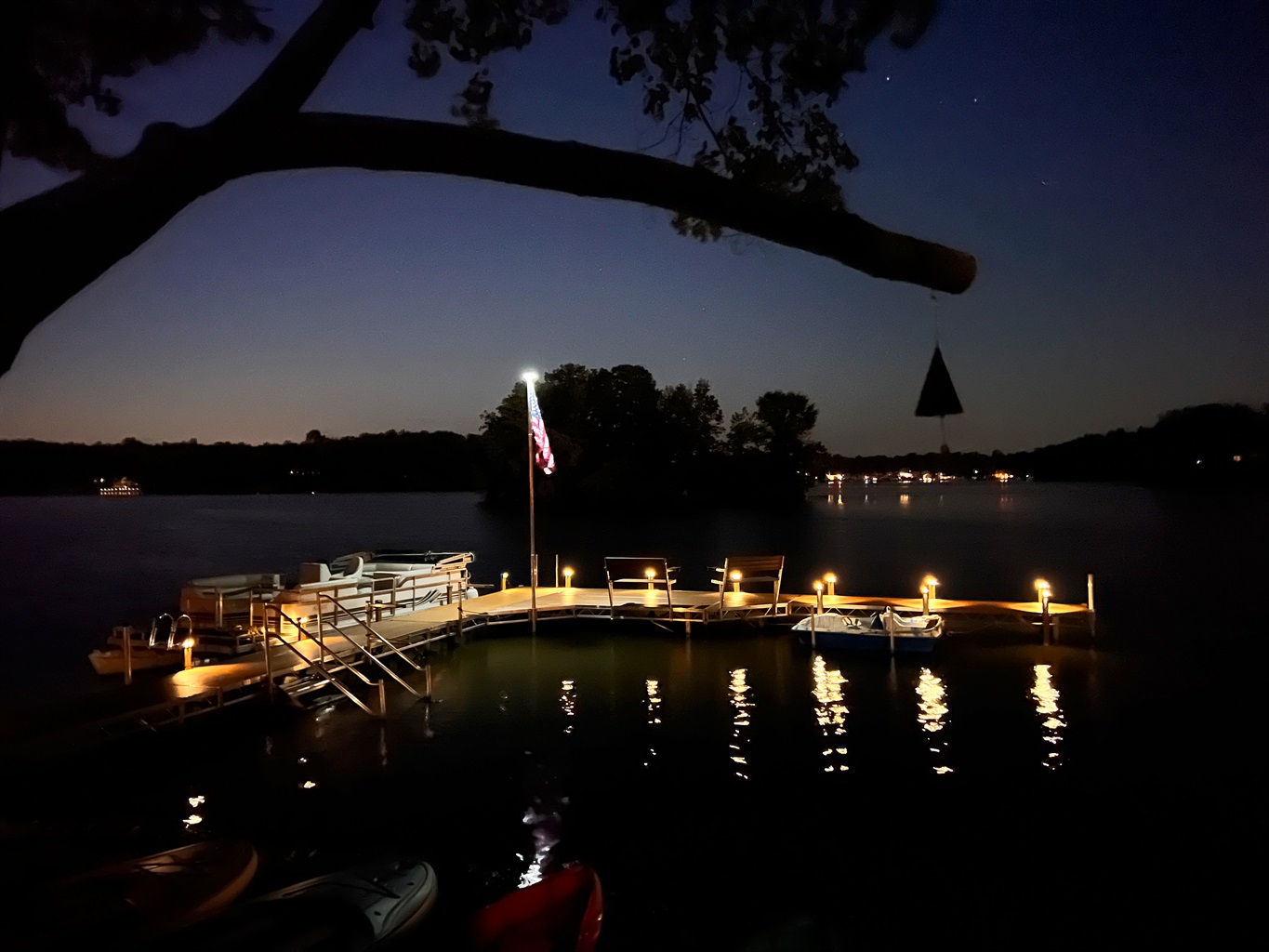 • Unwind: Hot tub, island fire pit, cornhole/bocce, pedal boat; bikes and kayaks/SUPs available seasonally.