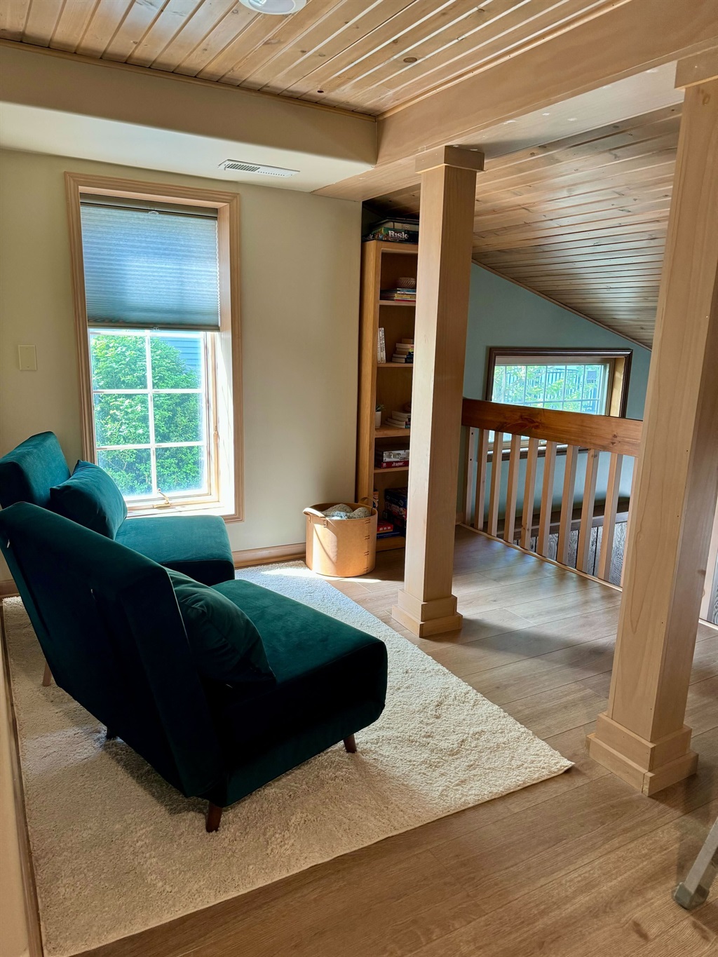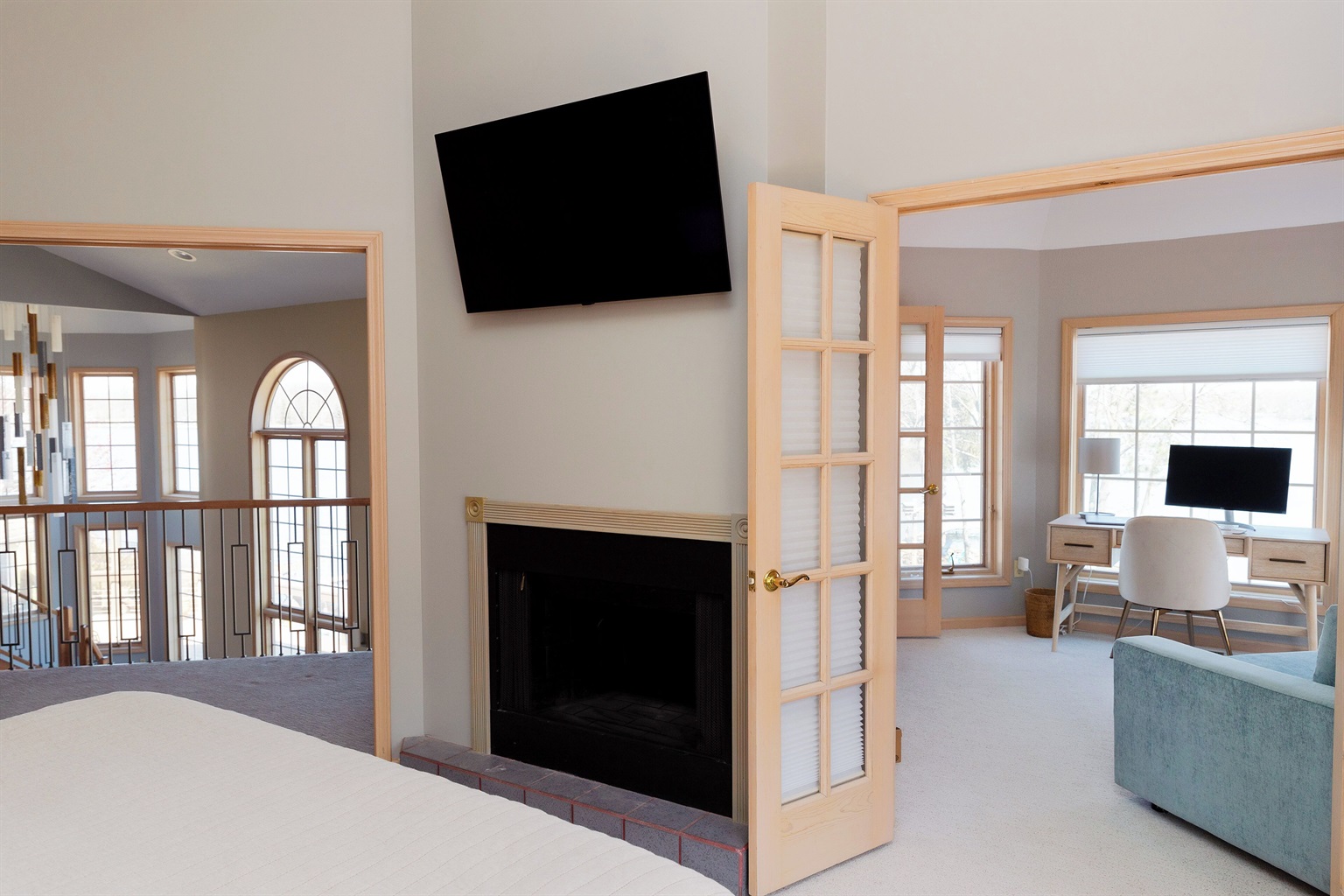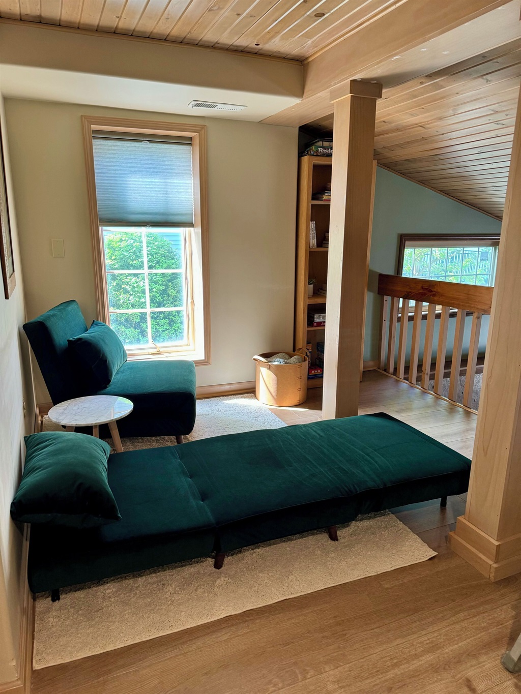 Upstairs you’ll find 1 bedroom with an ensuite bathroom (see sleeping setup), plus a private office/sitting room for those needing a quiet corner to work or unwind. Another full bath is located on the main level.